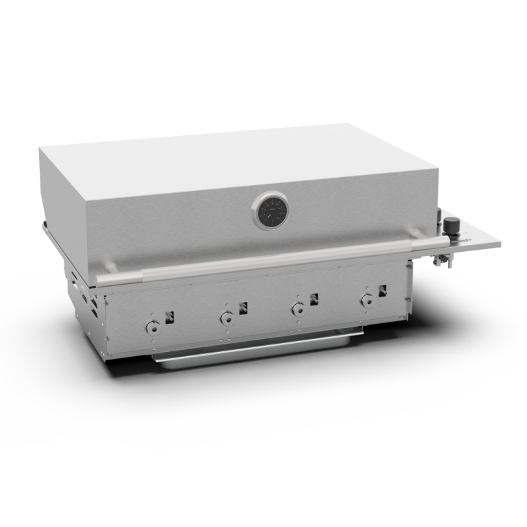 Barbacoa encastrable 100% en acero inoxidable, con 4 quemadores + infrarrojo trasero. Potencia profesional y diseño elegante para cocinas exteriores premium.
